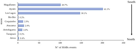 This review analyses the occurrence of historical HAB events in Chile, focusing on two of the three HAB types [20]: First, toxic HAB events, and ichthyotoxic HAB events or events capable of causing damage to fish.