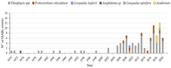 A total of 67 HAB events associated with Alexandrium spp were recorded, with 36 fatalities and 497 intoxications. The events occur mainly in the spring–summer months, with some exceptions in the far south of the country. The most toxic events occurred in the years 1996, 1997, 1998, 2000, 2002, 2003, 2005, 2006, 2009, 2016 and 2017, and were associated with a greater number of intoxications and fatalities (Table S1). In some cases (1972, 2002, 2016), PSP toxicity exceeded 10,000 µg STX eq./100 g.