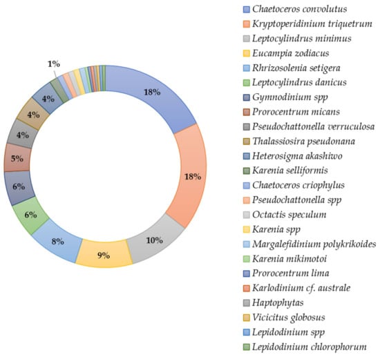 In the case of diatoms, 14 taxa were registered: Chaetoceros convolutus; Chaetoceros cryophilus; Eucampia zodiacus; Leptocylindrus danicus; Leptocylindrus minimus; Pseudo-nitzschia australis; Pseudo-nitzschia calliantha; Pseudo-nitzschia delicatissima; Pseudo-nitzschia pseudodelicatissima; Pseudo-nitzschia seriata; Pseudo-nitzschia spp.; Pseudo-nitzschia subfraudulenta; Rhizosolenia setigera; Thalassiosira pseudonana.