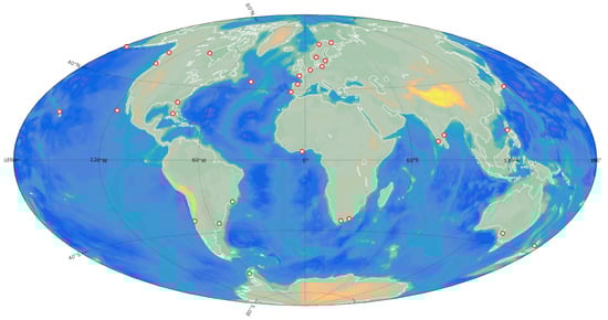 The primary aim of the present paper is to apply the same analysis to the global database of tide gauges. The tide gauge data are maintained by the Permanent Service of Mean Sea Level (PSMSL, https://www.psmsl.org/data/obtaining/complete.php (accessed on 5 July, 2020). Measurements of coastal sea level are available at 1548 sites; the raw data at all sites are shown in Figure 1.