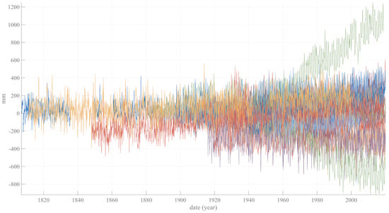 The two tide gauges that have large slopes (plotted in green in Figure 3), one positive (Manila, S. Harbor, Philippines) and one negative (Churchill, Canada), outline a funnel shape (see Table 1). The funnel undergoes rapid growth after 1950, with a total amplitude of 2 m, determined by the two extrema at Manila and Churchill. The annual oscillation, first identified by Marmer [12], has an amplitude in the order of 200 mm (peak to trough) for all tide gauges. The individual data points are shown in Figure 4a.