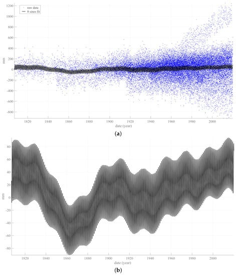 We then determine a smooth mathematical model of the mean sea-level variations as a function of time, in a least squares sense (e.g., [59]). For a mathematical representation of this smooth model, we can choose between polynomials, sine functions, exponentials, or splines. We select sine functions, based on our previous experience with the Brest data [26]. We add sine components progressively, until no more significant information is brought by the new component (in the sense of the Akaike criterion, see [60] used in [45]). In the present case, this leads to a model consisting of eight sine components. This model is shown with the data in Figure 4a and enlarged in Figure 4b.