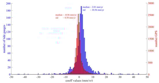 As noted above, the GPS data series of VLM are all shorter than 30 years, which makes it impossible to directly combine them with the tide gauge data that are far longer on average and allow one to explore much longer periods. Unable to do better, one can at least calculate a recent (present) trend, applying a simple linear regression to the GPS data. Furthermore, a simple linear regression of all the series shown in Figure 3 allows a comparison and combination of the gauge and VLM data: Figure 6 shows the respective histograms of the slopes of the 1548 gauges and of the GPS at the same (or close by) coastal locations (Figure 7). The median for tide gauges is +2.0 mm/yr and 92.7 % of gauges have slopes between −10 and +10 mm/yr; the median for VLM is −0.6 mm/yr and 96.0 % of the values are between −10 and +10 mm/yr. The locations and values of the tide gauges and the VLM are plotted, respectively, in Figure 7a,b. Over a large part of the coastal areas, the tide gauge signal and the VLM appear to be opposite in sign, that is, anti-symmetrical (e.g., North America, the Mediterranean region). The results of this analysis are in full agreement with the thorough study of [8], in which water rises as the land tends to subside and vice versa.