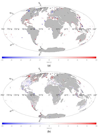 The second half of Equation (3), that is, vertical land motion VLM = , can be accessed through GPS measurements. These allow far better coverage of Earth surface but cover a much shorter span of time, generally 30 yr at most. For that reason, only “recent” trends covering that period can be accessed. A very thorough analysis of these data has recently been published by [8]. The database is maintained by the Nevada Geodetic Laboratory, with 19286 sites scattered throughout the globe, and is called Median Interannual Difference Adjusted for Skewness (MIDAS, http://geodesy.unr.edu/velocities/ (accessed on 5 July 2020).