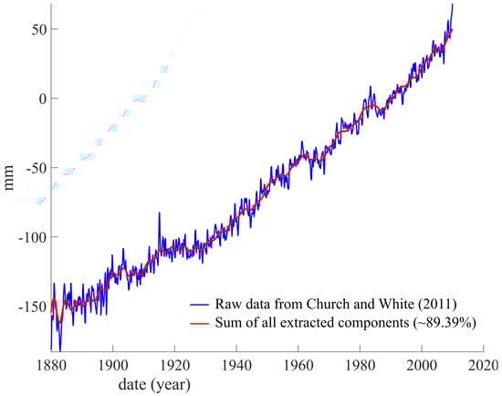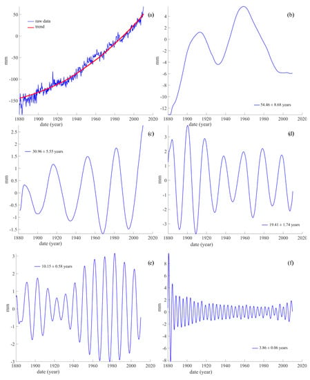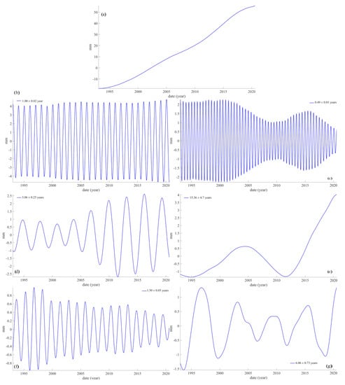 We select first that by [27], Figure 8. These authors estimated the rise in global average sea level from a combination of satellite altimeter data for the period 1993–2009 with coastal and island sea-level (tide gauge) measurements from 1880 to 2009. Variations in GSL as a function of time are provided by NASA (https://podaac-tools.jpl.nasa.gov/drive/files/allData/merged$_$alt/L2/TP$_$J1$_$OSTM/global$_$mean$_$sea$_$level/GMSL$_$TPJAOS$_$5.0$_$199209$_$202008.txt (accessed on 5 July, 2020). The SSA of the resulting curve GSLl (l for long) yields a trend and components at 54.5 ± 8.7, 19.4 ± 1.7, 10.1 ± 0.6, 3.9 ± 0.1 and 31.0 ± 5.5 yr (Table 2 and Figure 9) in order of decreasing amplitude (or roughly, given the uncertainties trend, 60, 20, 11, 4 and 30 yr). These components are shown in Figure 09 (in order of decreasing period); their sum amounts to 89.4% of the series total variance (Figure 8). The 3.9 yr component could correspond to the second harmonic of the Schwabe cycle [38]. Note that the prominent 1 and 0.5 yr variations have been filtered out by [27].
