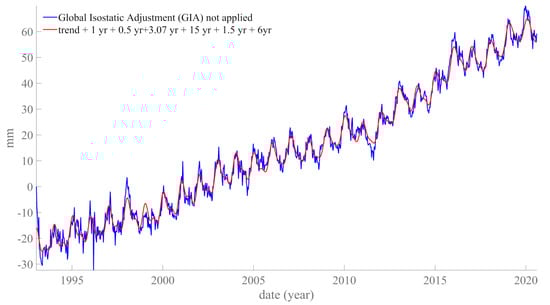 Since the 1880–2009 GSLl incorporates two very different data sets (measurements from tide gauges and satellites), we have resumed the analysis for the 1993–2009 GSLs (s for short) based on satellite data only. For details on the structure of the data, we refer the reader to [65]. For explanations on how the data set has been created from 27 years of altimetric measurements by the successive satellites TOPEX/Poseidon (T/P), Jason-1, Jason-2 and Jason-3, we refer the reader to [66,67]. The global mean sea-level data consist in several sets of time series, some with a “Global Isostatic Adjustment applied”, and some “GIA not applied”. The latter (without GIA) is shown in Figure 10, from January 1993 to August 2020, with a sampling interval of 9.92 days.