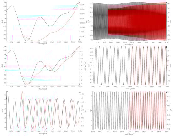 Top left, the superposition of the trends of GSLTG (in black) and GP (in red). Middle left, the superposition of the trend of GSLTG (in black) and the first derivative of the trend of GP (in red). Bottom left, the ∼20 yr components of GP (red) and GSLTG (black). Top right and middle right (a zoom), the annual oscillations of GSLTG (black) and GP (red). Bottom right, the semi-annual cycles of GP (red) and GSLTG (black).