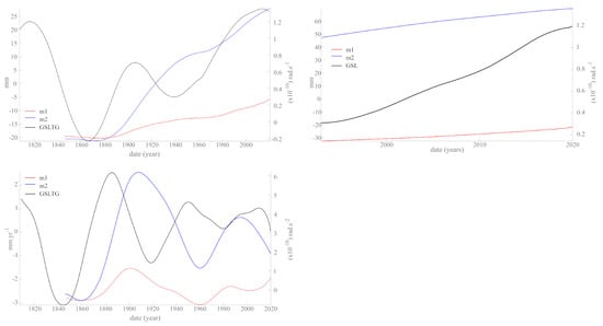 The series of data describing the rotation pole coordinates (RP) is maintained by the International Earth Rotation and Reference Systems Service (IERS, https://www.iers.org/IERS/EN/DataProducts/EarthOrientationData/eop.html accessed on 5 July 2020). Two series of measurements of pole coordinates and are provided by IERS under the codes EOP-C01-IAU1980 and EOP-14-C04. The first one runs from 1846 to 1 July 2020 with a sampling rate of 18.26 days, and the second runs from 1962 to 1 July 2020 with daily sampling. Figure 13 displays the trends (top) and derivatives (bottom) of the rotation pole (RP) coordinates and together with those of GSLTG (1807–2020). There is a suggestive anti-correlation between the trend of GSLTG and the derivative of the trend of (GSLTG∼(d/dt) RP), with the former leading the latter by several decades (Figure 13, lower left). This behavior was noted for the Brest tide gauge by [32]. This is yet another line of observational evidence that the sea-level curve based on tide gauges has an underlying physical mechanism.