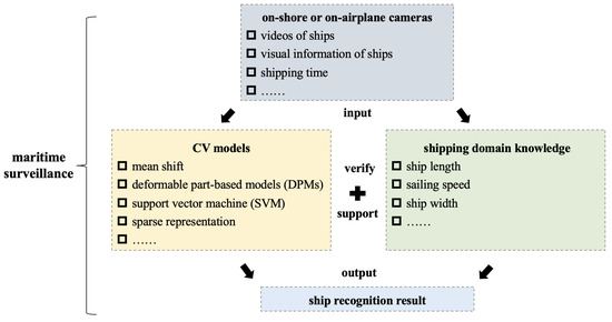 With the popularization of artificial intelligence (AI) and Internet of Things (IoT), maritime transportation have witnessed and benefited from the rapid development of intelligent vision techniques in video surveillance [12,13]. For instance, at important inlets or estuaries, cameras are often set up to catch illegal riverboats entering the sea. Some cameras are also mounted on unmanned or commercial aircraft to record images of shipping vessels and are used for identifying illegal shipping practices, such as illegal fishing. One critical issue in maritime surveillance is the timely, automatic, and accurate recognition and monitoring of ships. To be specific, on-shore or on-airplane cameras can provide videos and capture the visual information of ships. Then, CV methods, such as mean shift [14], deformable part-based models (DPMs) [15], support vector machine (SVM) [16], and sparse representation [17], are proposed to recognize the specific type of the ships, called ship recognition in the following context for simplicity. Over the past several years, various advanced CV models have been developed to improve the accuracy of recognition results [18].