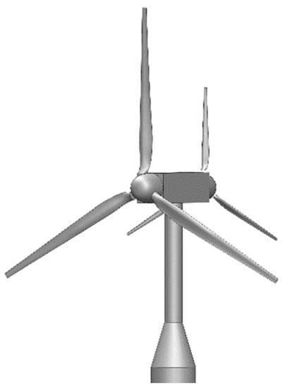 The NREL Offshore Baseline-5 MW wind turbine and the NREL 750 kW Wind PACT baseline wind turbine were selected as the main rotor and the auxiliary rotor for DRWTs. The main information on these two wind turbines is open access and has been used in research on wind turbine dynamics [20,21]. The blade cross-sections of the 5 MW turbine adopted the DU and NACA airfoils, and the blade cross-sections of the 750 kW turbine adopted the S airfoil. The detailed parameters of the 5 MW and 750 kW turbines are given in Table 1.