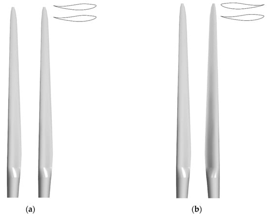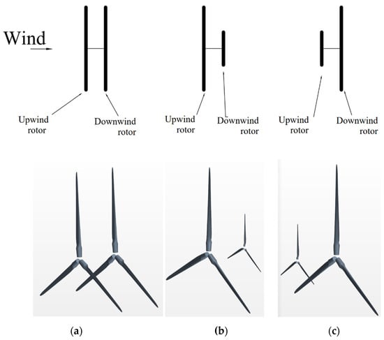 Three types of DRWTs were mounted on 5 MW and 750 kW wind turbines, i.e., 5 MW-5 MW, 5 MW-750 kW and 750 kW-5 MW DRWTs, as shown in Figure 2. Each DRWT adopted co-rotating and counter-rotating configurations. Figure 2a shows 5 MW-5 MW DRWT, Figure 2b shows 5 MW-750 kW DRWT and Figure 2c shows 750 kW-5 MW DRWT. Figure 3 shows the blade details for co-rotating and counter-rotating configurations.