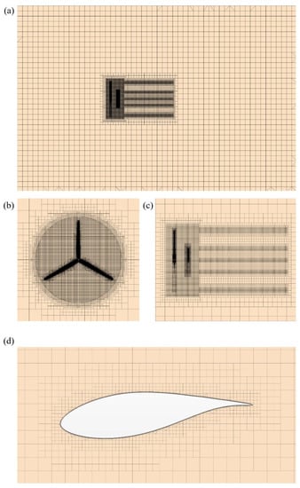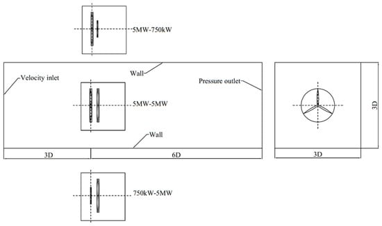 The computational settings, including boundary conditions and grid resolutions, are shown in Figure 4 and Figure 5. The computational domain consisted of a rectangular background region and wind turbine rotation regions. The height and width of the background region were 3D, the inlet was located in 3D on the rotor, and the outlet was located in 6 D downstream of the center of the upwind rotor. The inlet was set to a constant wind speed of 11.4 m/s as the rated working wind speed [20,21], and the outlet was set as a pressure outlet. The computational domain was discretized by structured trimmer grids, and, in order to capture the flow around the blade and trailing vortices accurately, it was necessary to refine the grids around the rotor and the grids at the back of the rotor blade tips. Boundary layer grids were created in the peripheral area of the blade. The total length of the boundary layer grid was 0.02 m, which was divided into 9 grids, and the ratio between two neighboring cells was 1.5. The Y plus value of blades was less than 4. According to the technical literature, the rotor speed was set to 12.1 rpm for 5 MW and 28.648 rpm for 750 kW [20,21] as rated working conditions, and the rotor speed was not adjusted for the DRWTs.