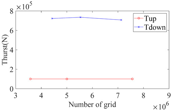 Figure 6 presents the grid convergence based on the thrust force values of 5 MW SRWT and 750 kW SRWT versus the number of grids. Three different sizes of grids were used to test the grid convergence. There were no noticeable differences between the thrust force values of the two turbines with different grid settings. The stable numerical results of thrust prove that the grid setting was reasonable. The number of grids for a DRWT is the sum of the corresponding single wind turbines. In the following simulation, the number of 5 MW turbine grids is 7.12 million, the number of 750 kW turbine grids is 7.56 million, the number of 5 MW-5 MW DRWT grids is 14.02 million, and the number of DRWT grids composed of 5 MW and 750 kW SRWT is 10.88 million grids.