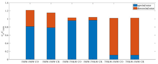 Meanwhile, the power coefficients of the upwind rotors also had a slight decrease compared with those of the corresponding SRWTs. The power coefficients of the upwind rotors of the 5 MW-5 MW CO-DRWT, 5 MW-5 MW CR-DRWT, 750 kW-5 MW CO-DRWT and 750 kW-5 MW CR-DRWT were reduced to about 80% of the corresponding SRWT, while the upwind rotors’ power coefficients of the 5 MW-750 kW CO-DRWT and CR-DRWT were reduced to about 96% of the corresponding SRWT. The power output decrease of the upwind rotor was caused by the negative influence of the downwind rotor when the upwind rotor and the downwind rotor rotated together. The shadow formed by the rotation of the downwind rotor blocks the wake flow of the upwind rotor, and this causes a power coefficient decrease in the upwind rotor. The negative influence is related to the rotating disk area formed by the downwind rotor. The 5 MW rotor was used in both the 5 MW-5 MW CO-DRWT and 5 MW-750 kW CO-DRWT; the individual upwind 5 MW rotors’ power coefficient was reduced to 81% and 96% of that of the 5 MW SRWT, and the 5 MW-5 MW CR-DRWT and 5 MW-750 kW CR-DRWT have a similar tendency. This is because the 5 MW-750 kW CO-DRWT and CR-DRWT use a 750 kW rotor, which has a smaller rotating disk area than the downwind rotor.