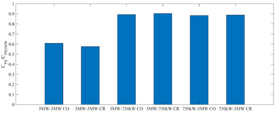 In the following section, to further explain how to evaluate the negative effects between the downwind rotor and the upwind rotor, this study adopted the power solidity ratio to compare the performance of different DRWTs. The power solidity ratio is defined as the power coefficient divided by the projected area of the total blade sum of the upwind rotor and the downwind rotor. The power solidity ratio of the 5 WM SRWT was used to normalize the power coefficient of DRWTs. There was a large gap between the power output of 5 MW and 750 kW single-rotor wind turbines. Only comparing the power coefficient of DRWTs cannot show which DRWT has better performance. Lee et al. [14] used solidity (the ratio of total blade area to rotor disk area) as an evaluation index to compare the power performance of DRWTs. This study proposed a comparison of the power performance of 5 MW-5 MW, 5 MW-750 kW, and 750 kW-5 MW CO-DRWTs and CR-DRWTs with the CPS of DRWTs. The CPS of the 5 MW SRWT was used to normalize the CPS of DRWTs. Figure 9 gives the result of the normalized CPS of CO-DRWTs and CR-DRWTs.
