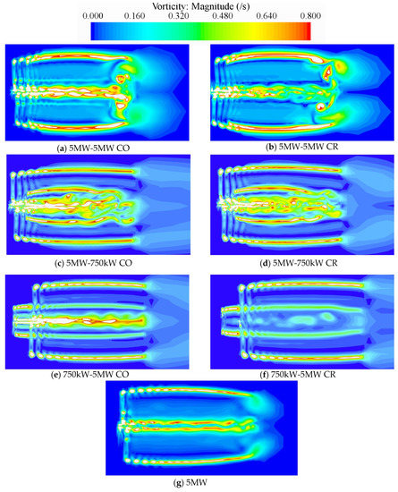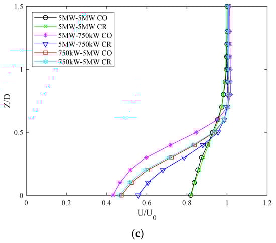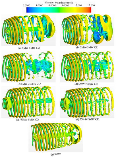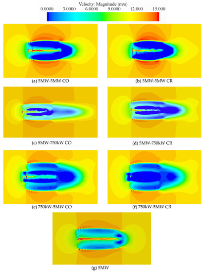 Compared with 5 MW-750 kW and 750 kW-5 MW DRWTs, the 5 MW-5 MW CO-DRWT and CR-DRWT gave a larger velocity deficit in wake flow. This is consistent with what has been mentioned in Section 3.1; the 5 MW-5 MW CO-DRWT and 5 MW-5 MW CR-DRWT had a higher normalized power coefficient. In DRWTs composed of 750 kW and 5 MW SRWTs, the downwind rotor of the DRWTs made use of the induced velocity in the upwind rotor wake in CR-DRWTs to produce about 10% more power output. Therefore, the velocity deficit in 5 MW-750 kW and 750 kW-5 MW CR-DRWTs was more significant than that in 5 MW-750 kW and 750 kW-5 MW CO-DRWTs.