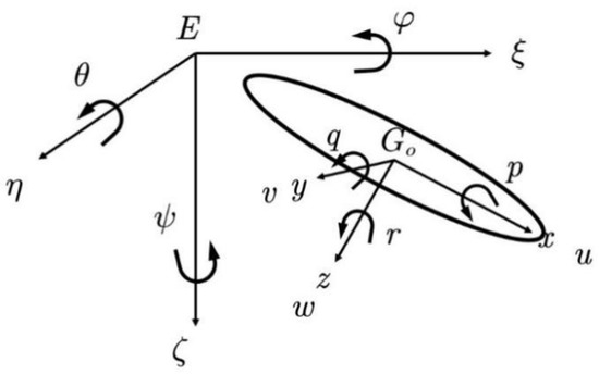 Assuming that its second-order viscous damping coefficient is relatively small, it can be regarded as a small external disturbance. Both the center of gravity and the center of floating are at the origin of the coordinate system, . The pitch angle is a small amount. Combining Equations (5) and (6), the linearized equations can be obtained as: