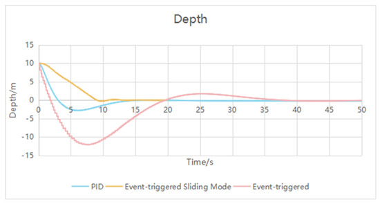 In the simulation process, it can be seen that the event trigger controller can realize AUV depth control, and that it is stable for about 41 s. Although it can reduce the amount of calculation, it takes a long time to stabilize.