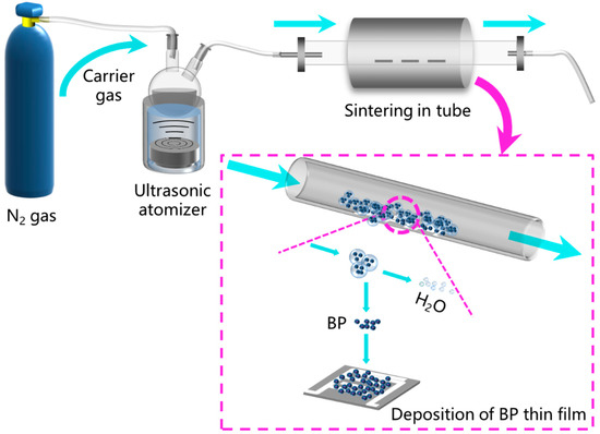 The BP gas sensors were fabricated by using the AACVD method [], which is illustrated in Figure 2. The alumina substrates, on which a pair of Ag interdigital electrodes were designed, were cleaned and placed in the tube. The BP QD aqueous solution was atomized and delivered by the N2 carrier gas with a flux of 100 sccm into the tube. The deposition was conducted at 250–450 °C and, thus, the BP thin films were obtained after the QDs were deposited on the alumina substrates.