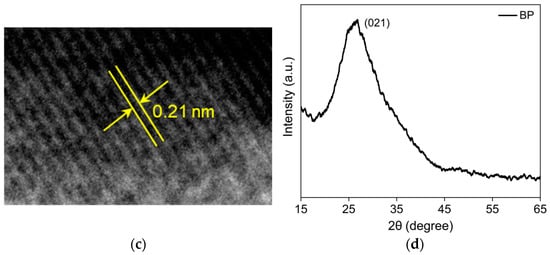 The microstructural properties and morphology of the as-synthesized BP QDs is shown in Figure 3. The HRTEM observation in Figure 3a shows that the BP QDs are of good dispersion in aqueous solution. Figure 3b demonstrates the size distribution of BP QDs, which indicates that the average size is approximately 2.8 nm. The high-resolution lattice fringes are clearly exhibited in Figure 3c. The fringe spacing of 0.21 nm is revealed and is associated with the (021) facet of the BP crystal lattice []. The XRD pattern of BP QDs is revealed in Figure 3d. The sole peak at 27.3° is observed, corresponding to the (021) facet of the BP lattice structure as listed in the standard pattern of JCPDS 01-076-1967 []. The broad shape of the peak infers the tiny crystallite structure of the BP QDs. Based on the Debye–Scherrer equation, the crystallite size is evaluated to be 2.5 nm, close to the HRTEM observation.