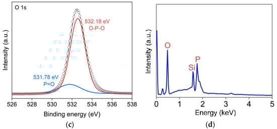 Figure 4a demonstrates the XPS survey spectrum of the BP thin films. All of the peaks are calibrated using the C peak at 284.8 eV [,]. The survey spectrum demonstrates the presence of P, O, Si, N and C. The tiny nitrous signal is ascribed to the impurities led by the N2 carrier gas during the deposition process, while the Si peak is caused by the quartz substrates used in the XPS characterizations. The high-resolution spectrum for the P element is revealed in Figure 4b, where double peaks at 130.48 eV and 134.78 eV are observed. The former one is assigned to the P 2p peak [] while the latter one is ascribed to the phosphorus oxide (POX) []. Thus, the as-synthesized BP QDs in aqueous solution are partially-oxidized. The O spectrum is exhibited in Figure 4c and is composed of double peaks at 531.78 eV and 532.18 eV. The high intensity peak is ascribed to the O-P-O bonds and the other one is caused by the bivalent bond (P=O) in oxidized phosphorus. Apart from the surface bonding properties evaluated by the XPS, the bulk composition of the BP QDs is analyzed by EDS, as shown in Figure 4d. The main signals of phosphorus and oxygen are detected together with silicon in the quartz substrates. The peak area proportion of each element is employed to evaluate the elemental composition of the sample. After deducting the stoichiometric O atoms of SiO2 in the quartz substrate, the P/O ratio is calculated to be 1.6, inferring that 1/4 of the P atoms in the BP structure are in the oxidizing state.