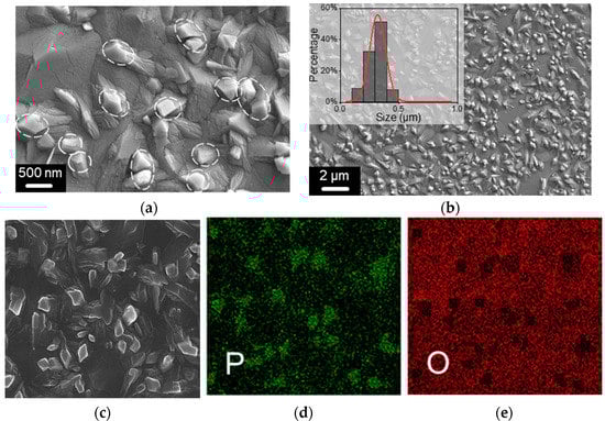 Microstructural and compositional properties of the BP thin film sensor: (a) SEM morphology; (b) SEM morphology with size distribution of grains; (c) Local morphology for elemental mapping; (d) Elemental distribution of P atoms; (e) Elemental distribution of O atoms.