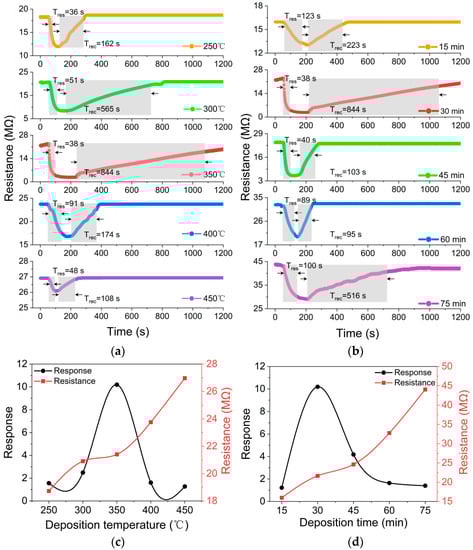 Gas-sensing properties of BP thin films: (a) Thin films deposited under various temperatures; (b) Thin films deposited under various times; (c) Influence of deposition temperature; (d) Influence of deposition time.