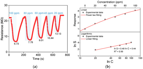 Gas-sensing properties of BP gas sensors deposited at 350 °C for 30 min: (a) Dynamic sensor response to various gas concentrations; (b) Evaluation of sensor sensitivity.