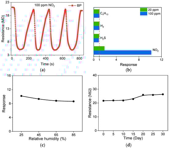 Repeatability and selectivity are the other two fundamental properties for gas sensors. Figure 8a demonstrates the repeatability test of the BP gas sensor, which exhibits a consistent response to 100 ppm NO2 among four cycles of 800 s. The selectivity test is conducted by using the target gases NO2, H2S, H2 and C4H10. The response to the four types of gases at 20 and 100 ppm are shown in Figure 8b. As the p-type nature of BP thin film, the sensor shows a response below 1 when reducing H2S gas is tested. Meanwhile, the BP thin film is insensitive to H2 and C4H10. The dependence of sensor performance on humidity is shown in Figure 8c, where a slight decrease in response is observed, showing that the BP thin film shows good stability against humidity. The insensitive RH dependence could be ascribed to the partially-oxidized surface of the BP thin film. Nevertheless, humidity corrections or compensations could be carried out if precise detection is required. The sensor resistance in this work is in the range of 10–50 MΩ, which is at the same level with sensors from previous works []. The time-dependent resistance of thin film is evaluated within 30 days. As shown in Figure 8d, the sensor resistance demonstrates general stability over time. A minor increase in resistance is observed after 10 days and this could be due to further slight oxidation of the BP thin films. Therefore, the as-prepared BP thin film gas sensor demonstrates excellent repeatability, selectivity and stability in the detection of NO2 gas. The NO2 sensing performance of the BP-based gas sensor is compared in Table 1. The present BP thin film gas sensor has superior gas-sensing properties to other published devices.