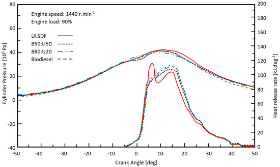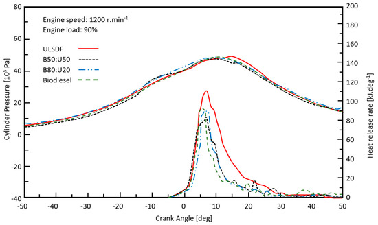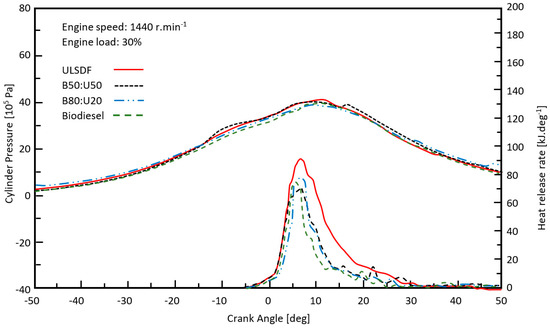 The speed of heat generation and the in-cylinder pressure values are shown in Figure 2, Figure 3, Figure 4, Figure 5, Figure 6 and Figure 7 as curves for various tested fuels. Through more than 100 test cycles in which values were averaged, the impact of random changes in pressure data values on operation cycles can be reduced [31,32,33,34,35,36,37,38,39,40,41,42,43,44]. As shown in Figure 4 and Figure 7, increasing the biodiesel ratio in tested fuels reduces in-cylinder pressure with higher engine loads. The heat generation speed curves differ in the ULSD-F regime and in the biodiesel regime. Tests showed that ULSD-F with a biodiesel mixture raised in-cylinder pressure earlier compared to pure ULSD-F usage. It is generally known that the higher cetane number of biodiesel and its laminar flame speed are much higher in comparison to ULSD-F. It is obvious that the maximum heat generation speed is significantly decreased with a higher ratio of biodiesel in the tested fuels, as well as with reduced ignition lag. As the experiment showed, the combustion of ULSD-F at 30% load of the maximum tested engine torque started in the crankshaft angle position of −1° Crank Angle (CA), while the biodiesel combustion process started at the angle position of −2° CA. At 90% load, ULSD-F started to be combusted at −4° CA, and the value for the biodiesel was −6° CA. The ignition lag was reduced approximately by 2° CA. Furthermore, as the biodiesel-to-ULSD-F ratio increased, the heat generation speed decreased.