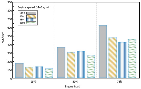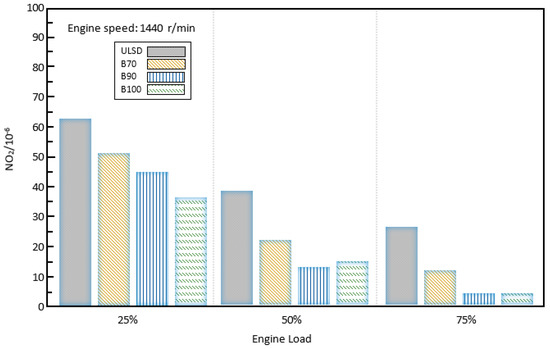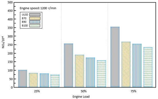 - With rising engine loads, NO emissions increase, but a higher amount of biodiesel can keep them lower. A noticeably reduced amount of NO2 emissions occurs with the increasing amount of biodiesel in the experimental fuel.