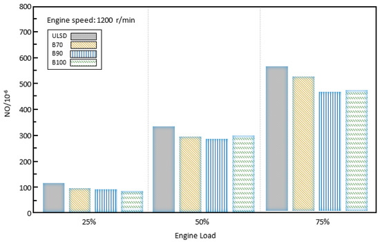 Higher generation of NOx emissions during engine operation relates to increasing engine speed and loads. Emissions values can reach a maximum of about 670 ppm in the case of ULSD-F and nearly 465 ppm in the pure biodiesel regime (Figure 11). With rising engine load and engine speed, the exhaust gas temperature also rises, which is the main cause of the rise in global NOx emissions [43].