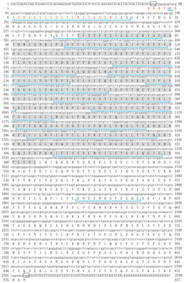 The full-length PmNHE cDNA was obtained by splicing the open reading frame and 5′/3′ non-coding region sequence sequencing results. PmNHE was 2788 bp long (GenBank accession No. MT164534), including an ORF of 2643 bp, a 5′-untranslated region (UTR) of 76 bp, and a 3′ UTR of 78 bp (Figure 1). The ORF of the PmNHE gene encoded 877 amino acids with a molecular weight of 97.97 KDa and a theoretical isoelectric point of 6.54. Bioinformatics prediction analysis showed that PmNHE had a variety of functional sites, contained 23 phosphorylation sites (20 serine sites and 3 threonine sites), 6 glycosylation sites (highlighted in green font), and 12 transmembrane domains (highlighted with light blue line segments). The sequence contains a sodium/proton exchanger domain (highlighted by gray shading) at 78-490 aa. The poly A structure is used in the 3′-UTR sequence (highlighted in italics).
