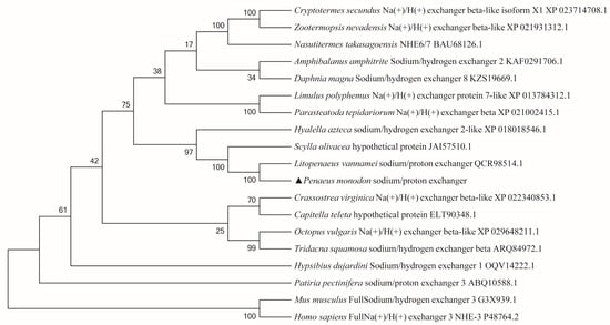 Phylogenetic analysis of PmNHE. (▲represents the PmNHE gene obtained in this study).