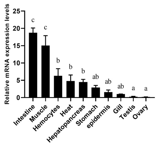 Relative expression of PmNHE in different tissues of Penaeus monodon. The values are x ± SD (n = 3). Bars with different lowercase letters indicate significant differences (p < 0.05).