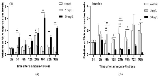 The mRNA expression levels of PmNHE in the gills and intestine at different time intervals of different-concentration ammonia nitrogen stress treatments. (a) Gill and (b) intestine under ammonia nitrogen stress. Data are shown as means ± SD (standard deviation) of three separate individuals. Significant differences are indicated with asterisks, * p < 0.05, ** p < 0.01.