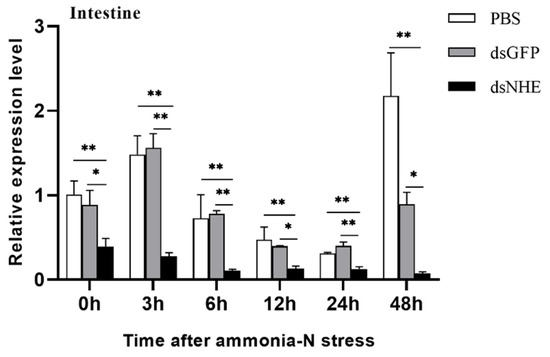 Silencing efficiency of PmNHE under ammonia-nitrogen stress. Data are shown as means ± SD (standard deviation) of three separate individuals. Significant differences are indicated with asterisks, * p < 0.05, ** p < 0.01.