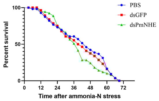 dsPmNHE, GFP, and PBS group shrimp were simultaneously stressed under a higher concentration of ammonia nitrogen; the number of dead shrimp in each group was observed and recorded every 3 h.