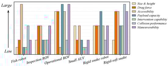 Underwater soft robot technology has developed rapidly in recent years, such as octopus tentacle soft arm [19,20], elephant trunk arm [21,22], and deep-sea self-powered soft fish [23], which shows that soft robot has broad prospects in a marine application. This paper, inspired by the locomotion gait of biological snakes, proposes an innovative modular underwater snake robot actuated by rigid propulsions and soft joints, which can improve the swimming efficiency and flexibility of the robot and reduce the probability of collision leading to damage. Based on the above presentation of the current state of underwater robots, and the rigid-soft snake robot presented in this paper, we summarize a variety of properties from size and weight, drag force, accessibility, payload capacity, intervention, collision consequence, and maneuverability, and the author compares these performances from low to large based on our own experience as shown in Figure 1. The proposal of the rigid-soft underwater snake robot provides a novel reference and choice for the diverse development of underwater robots.