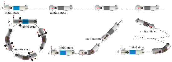 Schematic diagram of multi-modal motion of snake robot: (a) linear motion, (b) turning motion, (c) pitching motion, (d) helical motion.