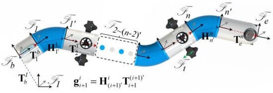 (1) Forward Kinematics: The snake robot is an articulated structure that consists of multiple rigid and soft bodies connected to each other, that is, a multibody system. A mathematically convenient and geometrically meaningful method is to use a homogeneous transformation matrix to represent the configuration of each part in the 3D Euclidean space and the transformations among these parts. For example, the pose of Fb with respect to FI is given by the homogeneous transformation matrix: