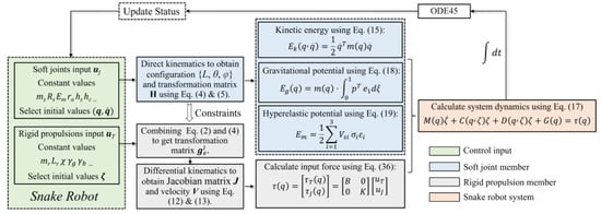 A flow chart of the snake robot system dynamics of (27), including the local dynamics of soft joints, and joint actuators and propellers’ inputs, can be seen in Figure 6. Finally, we can solve kinematics and dynamics parameters such as robot position, pose, force, linear velocity, and angular velocity by numerical Runge–Kutta method in a MATLAB environment. Therefore, multiple spatial motions of the snake robot will be widely generated in simulations, and then estimated through the following experiments.