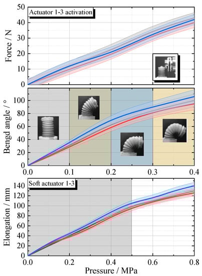 where C10~30 are the constant coefficient of soft material based on the Yeoh model, and its value can be measured by the uniaxial tensile test. is the first partial strain invariant, depending on the type of load applied. For the case of axial strain under the constant volume hypothesis, the first deviatoric strain invariant for actuator i is described as follows: