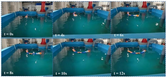 The types of modules developed for the snake robot include head modules, control modules, soft joint modules, rigid propulsion modules, and tail modules. The snake robot verified in this study is shown in Figure 7a, including 3 rigid modules and 2 soft joints. These rigid modules, whose casings have been 3D printed in plastic using selective laser sintering. The propellers are installed externally and internally to fabricate a rigid propulsion module. Since our soft actuator adopts a fabric-reinforced structure, possessing high strength, the output force and stiffness are also considerable, which can ensure the controllability of the posture during the motion of the snake robot. It must be pointed out that, in the manufacturing process of soft actuators, as multiple steps will inevitably produce errors, we have carried out the static pressure test for three actuators of one joint, and the static bending and force pressure test for one joint, as shown in Figure 8. The error below 0.5 MPa is lower, so the subsequent test is within this interval. Furthermore, in the design and manufacturing process, the mass distribution of the overall robot has been carefully considered. Firstly, the centroid of the robot is calculated by setting the density/mass of each module in Solidworks. Secondly, assuming that the robot has a uniform mass distribution, the buoyancy center of the robot can be obtained by Solidworks. Finally, the density design of the robot is close to water. The center of mass of the robot is slightly lower than the center of buoyancy, but on the same vertical axis as the center of buoyancy. These features contribute to the planar and spatial motion of the snake robot. We have verified the usability of this designed structure in the pool. Taking the horizontal plane turning as an example, the movement process of the robot is shown in Figure 9.