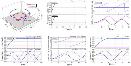 Yaw motion is represented by turning motion in a large space. For the snake robot, the turning motion can be realized in different ways. For example, the soft joint input is zero to keep it straight, and then input to the propeller on one side without input or negative signal on the other side, which can make the robot do the overall turning motion like an AUV. Or the input signal of the actuator makes the soft joint bend and then turns on the propeller to make the robot move in circles. We did a simulation comparison test, and the results can be seen in Appendix B. In fact, the motion of implementation achieved by thrusters and joints is the unique advantage of the snake robot, especially in the underwater confined space, the conventional AUVs are difficult or unable to pass, but the snake robot has a flexible body and can be bent locally, which will be easy to pass through. In the simulation, the propeller control parameters are set to uT(1) = uT(3) = uT(4) = uT(6) = 1, uT(2) = uT(5) = 0, and the soft joint control parameters are set to uJ(1) = uJ(4) = 0.3, uJ(2) = uJ(3) = uJ(5) = uJ(6) = 0. The above control input is named condition 1, which can make the robot do yaw and turn in the XOY plane. In order to verify the generality and rationality of the model, the control parameters of the soft joint are reset to uJ(1) = uJ(4) = 0.1, and other parameters remain unchanged. Such a control input is named condition 2. The trajectories of the motion under conditions 1 and 2 are shown in Figure 11, the configuration of soft joints, and the spatial position, linear velocity, orientation, and angular velocity are shown in Figure 11. It is clear that the range of motion increases as the bending angle of the joint decreases, i.e., the radius of gyration increases. Interestingly, the forward speed controlled by the propeller does not change and only changes the bending angle of the joint, which makes the positions of the rotation centers of the two conditions do not coincide and not on the same line. This relationship enables additional considerations for motion controller design and path planning for robotic snakes in practical applications requiring various steering conditions.