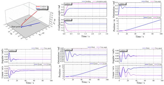 Pitch motion can also be realized in different control modes. For example, the longitudinal propeller can be manipulated to make the robot float or sink in a fixed attitude. However, due to the large side area, the water resistance will be large. The advantage of the snake robot is that it can coordinate the manipulation of the propeller and joints and can quickly reach the predetermined altitude. The simulation shows the pitching motion of the robot on the XOZ plane, in which the first sets of parameters are set as uT(1) = uT(3) = uT(4) = uT(6) = 1, uT(2) = uT(5) = 0, uJ(1) = 0.2, uJ(2) = 0.3, uJ(3) = uJ(4) = uJ(5) = uJ(6) = 0. The second sets of different control parameters are set as the soft joint parameters are changed to uJ(1) = 0.2, uJ(3) = 0.1, uJ(2) = 0, and the others remain unchanged. The pitch and heave motion trajectories of the two conditions are shown in Figure 12. The configuration of soft joints is shown in Figure 12, it should be pointed out that the pitch motion is in the XOZ plane, so the orientation angle of the soft joint is near 90°. Additionally, the spatial position, linear velocity, orientation, and angular velocity are shown in Figure 12. It is necessary to explain the reason for the oscillation at the beginning of the motion because the position of the center of gravity and the center of buoyancy changes in the Z-axis direction, which leads to the change of the propeller configuration matrix, and then becomes smooth as the motion becomes stable.