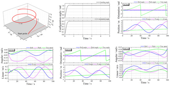 Spiral motion is one of the three-dimensional motion modes of snake robot. For spiral motion, the soft joint configuration needs to be adjusted so that the bending angle exists, and the orientation angle is between −π/2~π/2 rad. Therefore, the control parameters are set as follows: the parameters of propellers are set as uT(1) = uT(3) = uT(4) = uT(6) = 1, uT(2) = uT(5) = 0, and the control parameters of soft joints are set as uJ(1) = uJ(2) = 0.2, uJ(3) = uJ(4) = 0.3, uJ(5) = uJ(6) = 0. The trajectory of the motion is shown in Figure 13, and the configuration of soft joints is shown in Figure 13. In this case, we only do one set of simulations, but show the state of the base and end of the robot, and the three-dimensional position, orientation, linear and angular velocity are shown in Figure 13. In the simulation results, we found that the states of the base and the end are inconsistent. The main reason is the existence of joints, especially the soft joints that have less damping and are easier to deform, unlike the integral structure of AUV. Although the combination of soft joints can improve the performance of the snake robot, it cannot be ignored that it will pose a difficult problem for control. In fact, it reveals some general challenges that soft robot technology is faced with, that is, high nonlinearity, serious hysteresis, and poor repeatability, which mainly influence the accuracy.