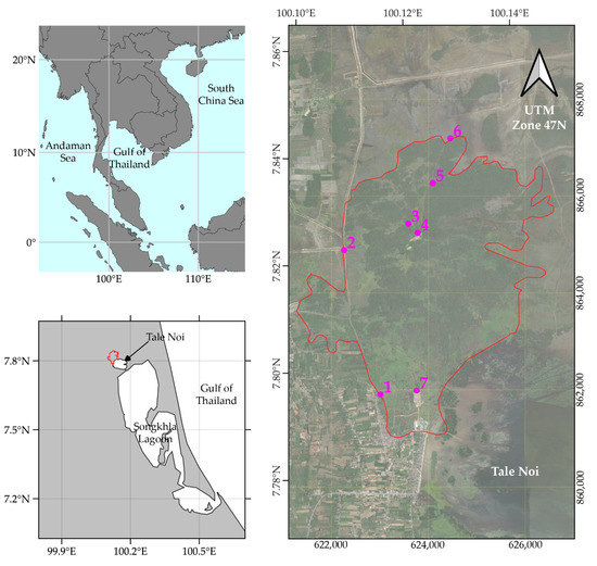 The Thale Noi Non-Hunting Area is one of the largest natural freshwater lakes in Southeast Asia [29], located in the Phatthalung province, Thailand. The Khuan Khi Sian wetland is located in the North of Thale Noi at an altitude of 7°49′ to 7°51′ N and longitude of 100°07′ to 100°09′ E with a total area of 59.58 square kilometers (Figure 1). This area has a high diversity of wetland habitat, including grassland, freshwater lake, Melaleuca swamp forest, rice fields, rubber plantations, mixed orchards, as well as being home to local communities, and hosting tourism and other human uses [30]. A wetland is an area that is completely submerged in water all year. The vegetation in the study area consists primarily of Melaleuca leucadendron, which serves as a nesting site for large water birds, as well as aquatic plants such as water lettuce.
