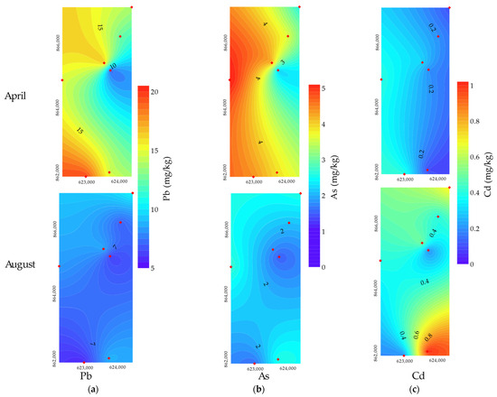 Heavy metal distribution (mg/kg dry weight) in the sediment cores of the Khuan Khi Sian wetland: (a) Pb, (b) As, and (c) Cd. (Note: April = dry season; August = wet season.).