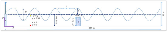We used the volume of fluid (VOF) model and open channel boundary conditions incorporated in ANSYS FLUENT to account for the water–air interaction in CFD wave flumes. The VOF model simulated multiphase fluids by solving a single set of momentum equations and monitoring the volume fraction of each fluid throughout the domain. We considered the standard laboratory environment such that two domains of air and water phases were created, with ambient densities of 1.225 and 998.2 , respectively. The air and water flow fields were computed by solving the unsteady Reynolds-averaged Navier–Stokes (URANS) equations with the shear stress transport (SST)–turbulent close model.